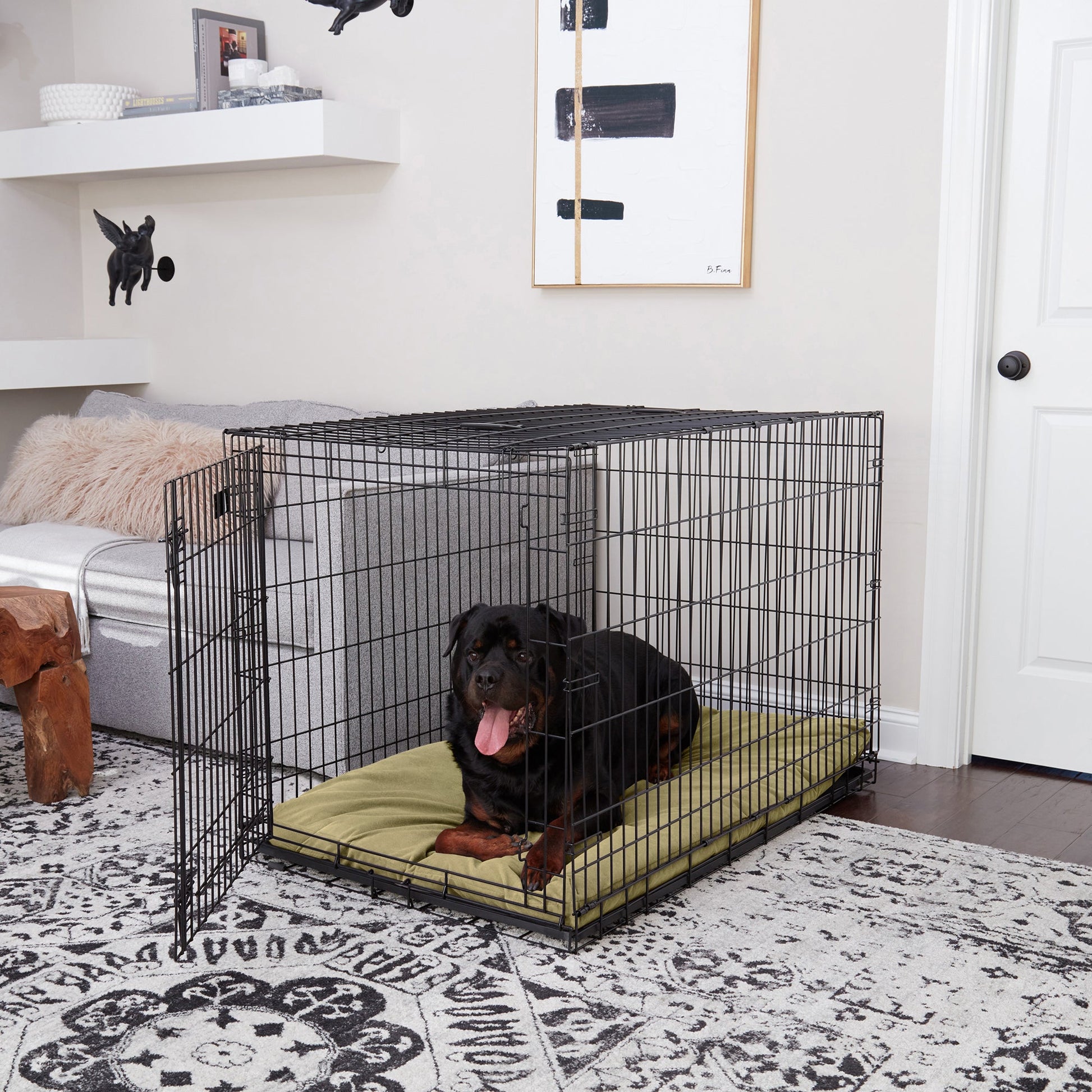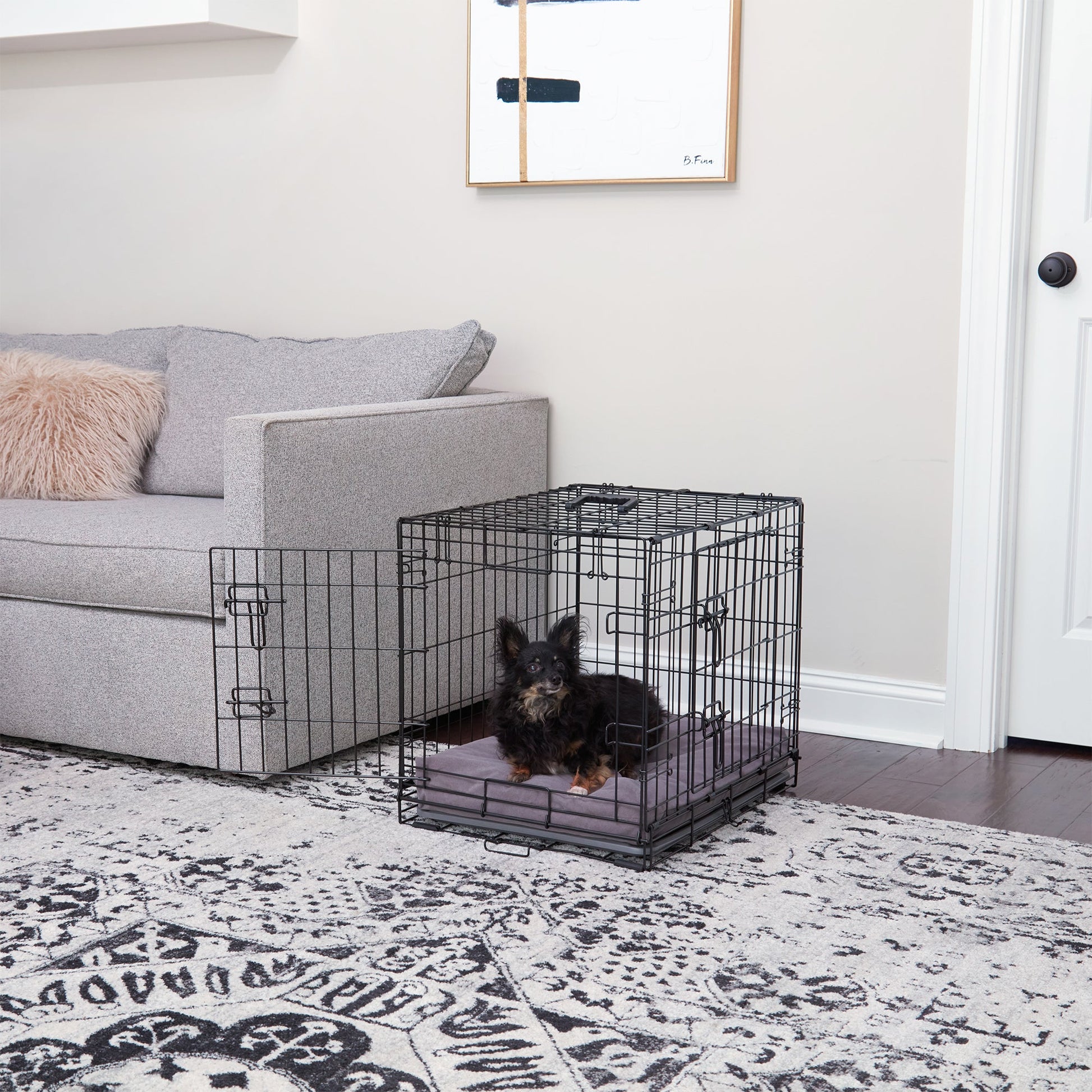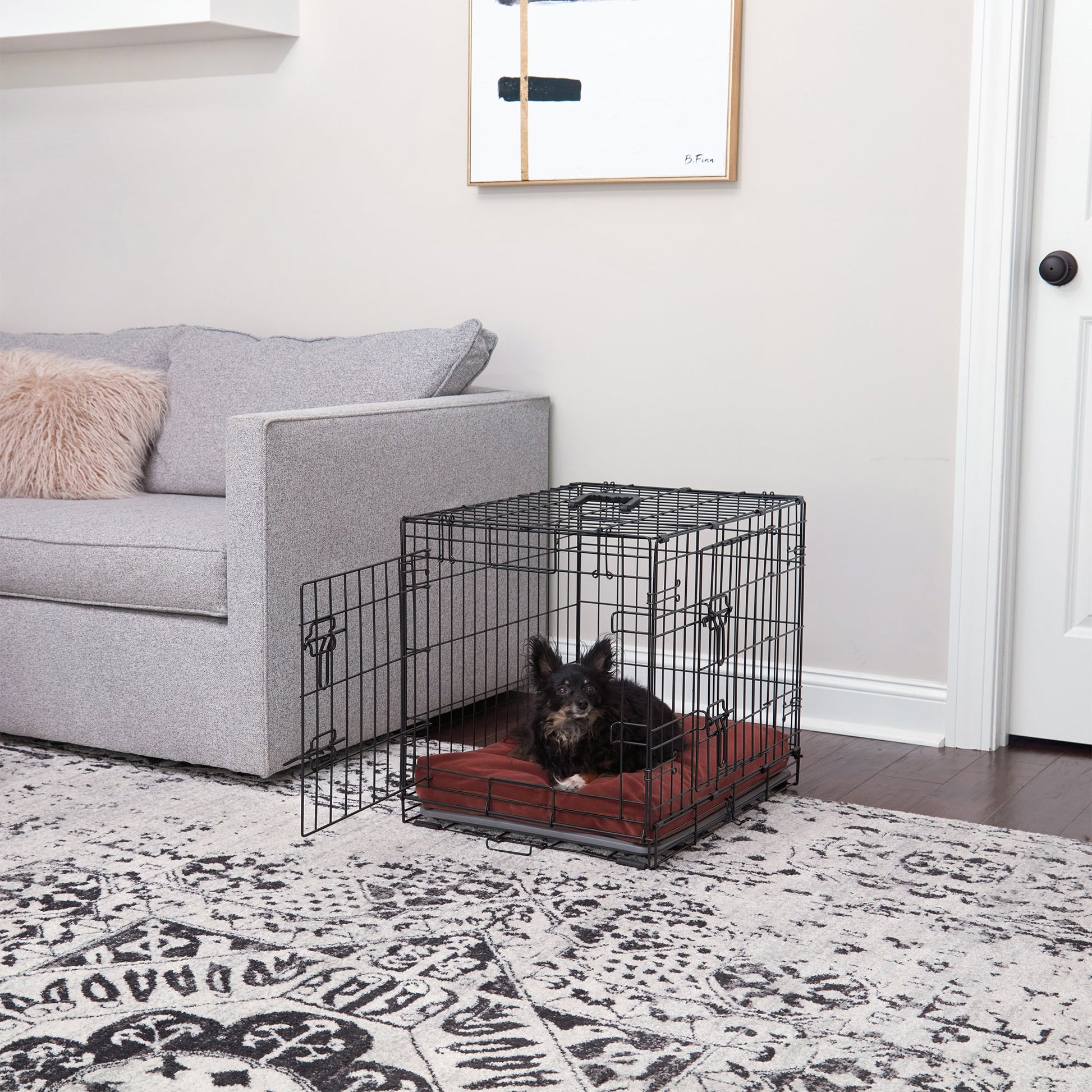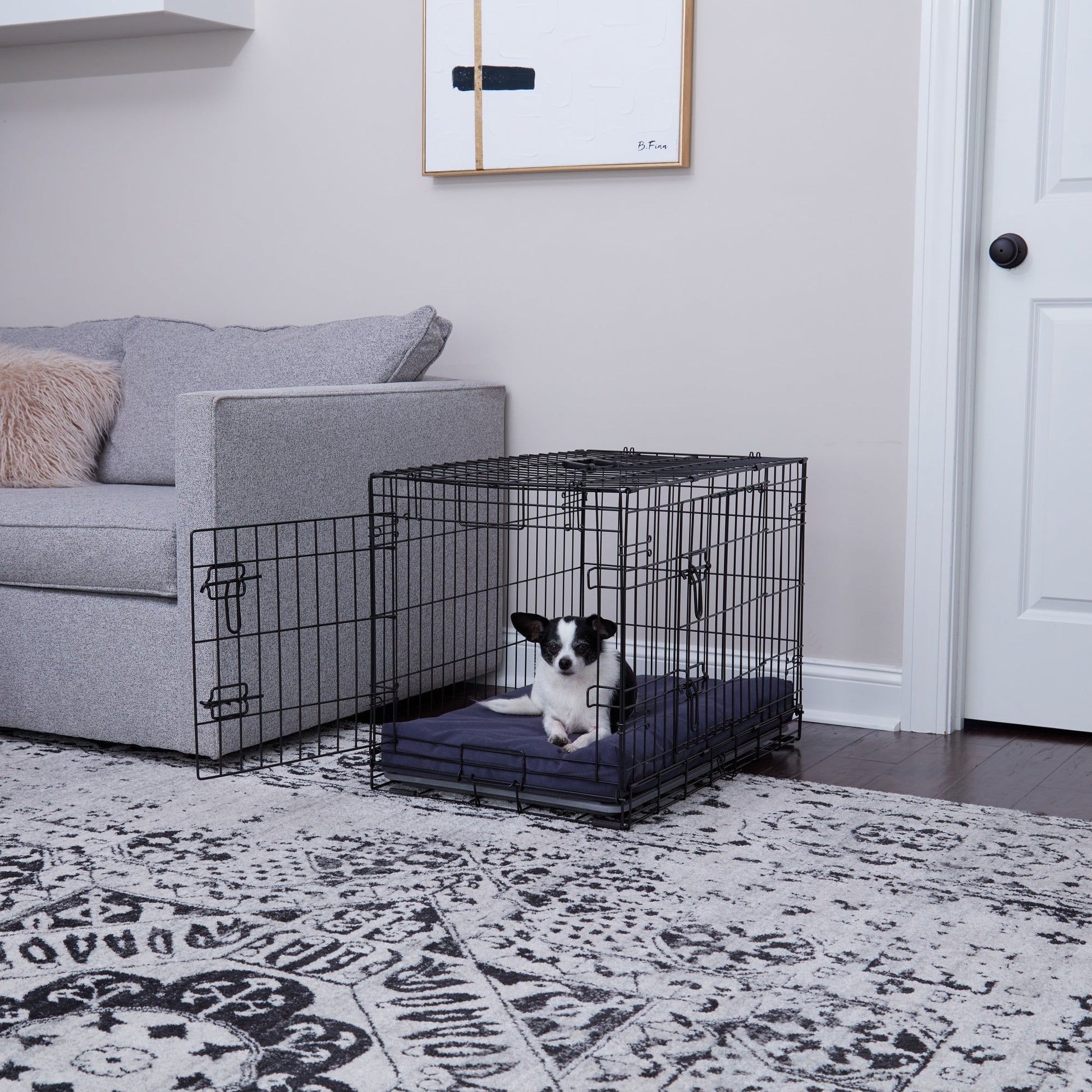 The Happy Hounds’ Cooper Deluxe Crate pad is designed to make your dog's crate time as comfortable as possible. The super soft microfiber fabric is both water and stain resistant, as well as machine washable for easy care. This reversible cushion was designed to fit most standard crates, but is plush enough to use as a simple pillow style bed out of the crate as well. The zipper closure allows for easy removal and cleaning of the cover. The channel-filled insert keeps fill in place for a consistent comfort for your pet. Insert is generously filled with a soft polyfiber made from 100% post-consumer recycled plastic. Available in multiple size and color options. Filled and finished in the USA. Cushion dimensions are +/- 1 inches. Please note product will arrive in a slightly compressed state; please allow a few days for product to expand to final size listed in description.